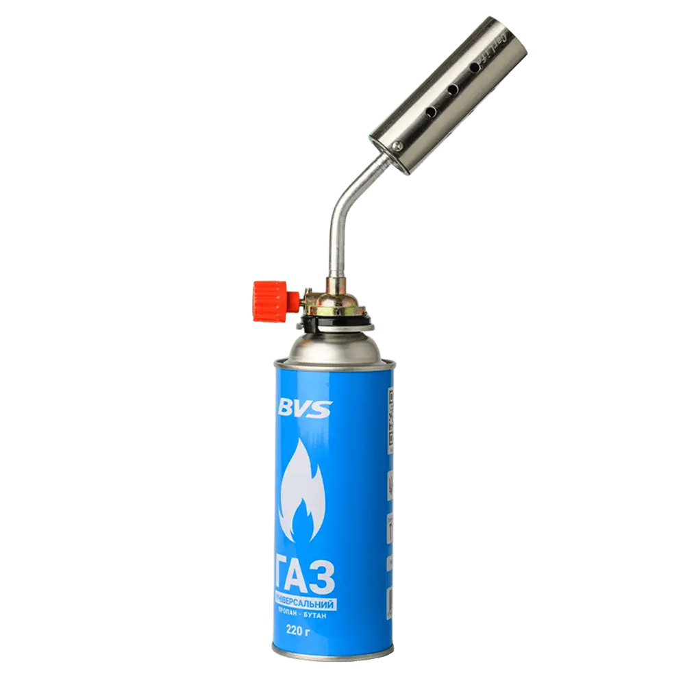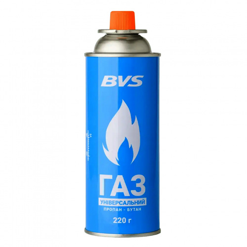 Газовый баллон с цанговым клапаном BVS 220g с 4-х сезонной смесью газов (пропан 60%, бутан 40%). Используется в портативных газовых плитах или с обычными резьбовыми газовыми горелками через переходник. Температура использования от -10 до +30 °C.