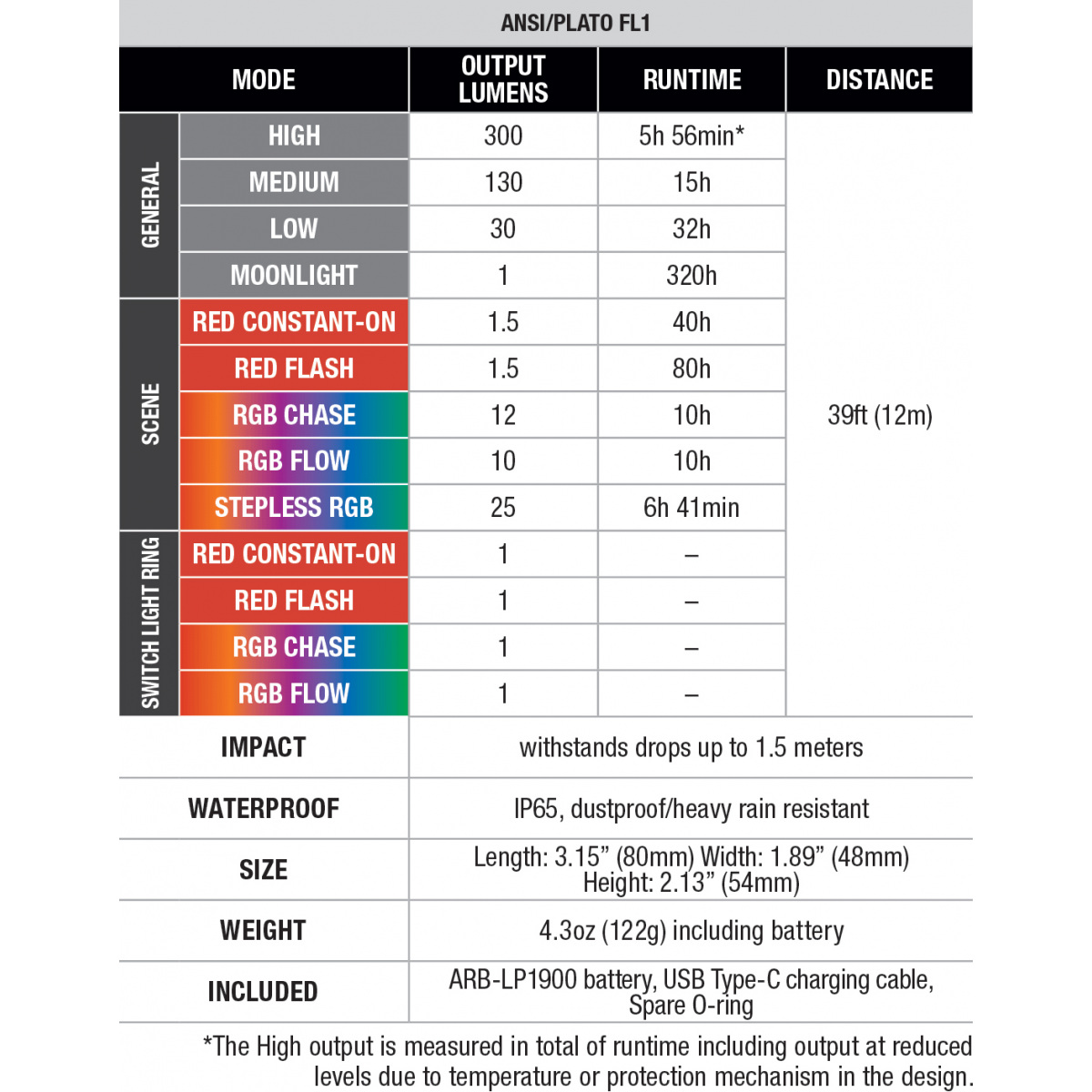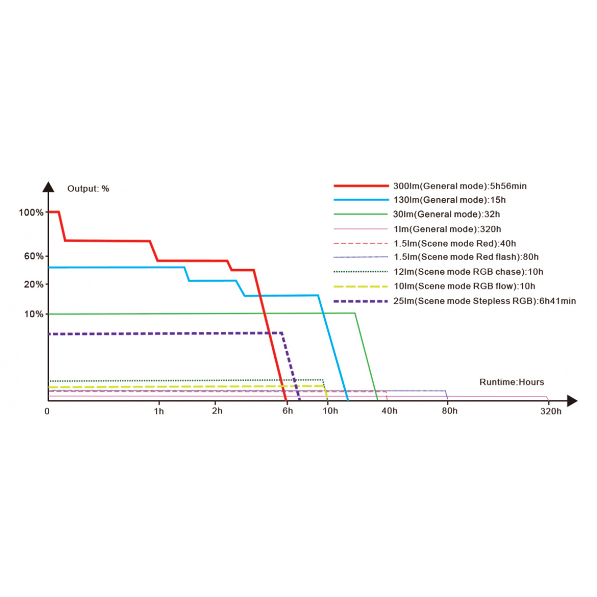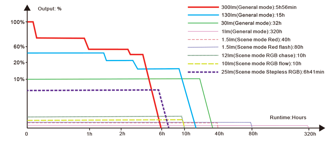 Внимание! Показатель времени работы в максимальном режиме (300 лм) рассчитан суммарно, учитывая автоматическое понижение яркости для защиты от перегрева. При использовании батареек типа AAA яркость и продолжительность работы могут отличаться от показателей, полученных на оригинальном аккумуляторе.