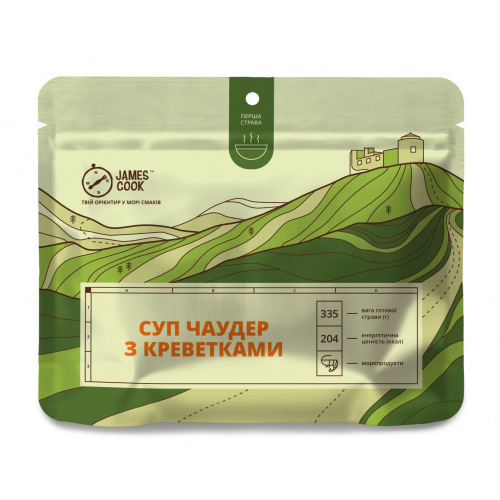 Чаудер от James Cook – это наваристый густой суп с добавлением молока, сливок, креветок и овощей. Это, на первый взгляд, необычное сочетание ингредиентов обеспечивает очень нежный и одновременно насыщенный вкус. Блюдо изготовлено методами высушивания и сублимации готовых продуктов для быстрого приготовления в туристических походах, путешествиях или в полевых условиях. Все, что нужно для приготовления – только кипяток, блюдо не нужно варить, достаточно просто запарить в пакете.