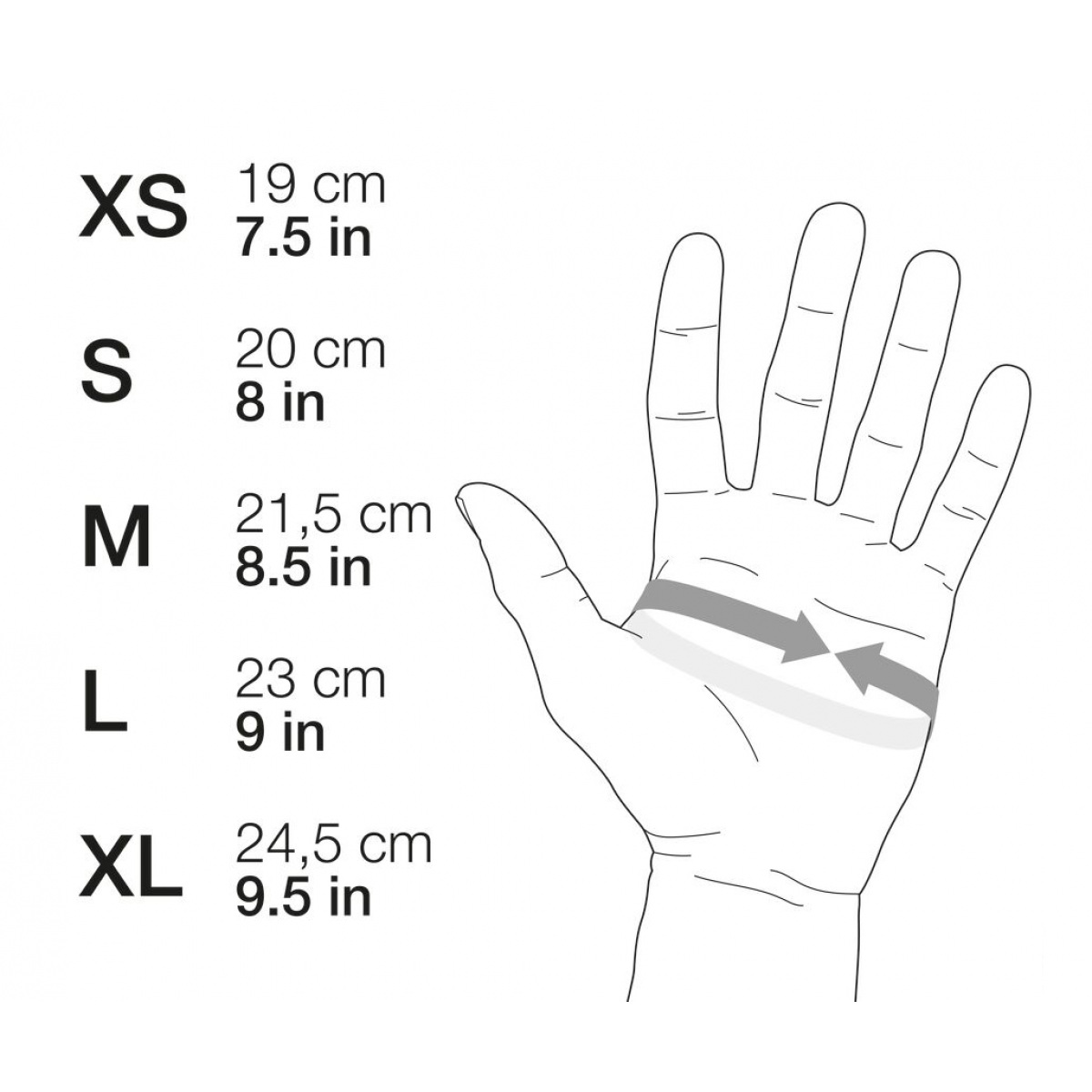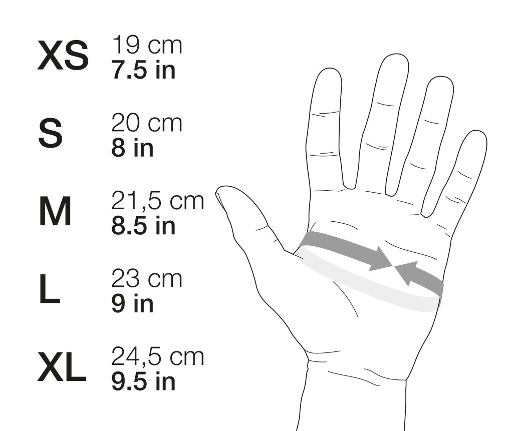 • обхват ладони: XS 19 см/S 20 см/M 21,5 см/L 23 см/XL 24,5 см