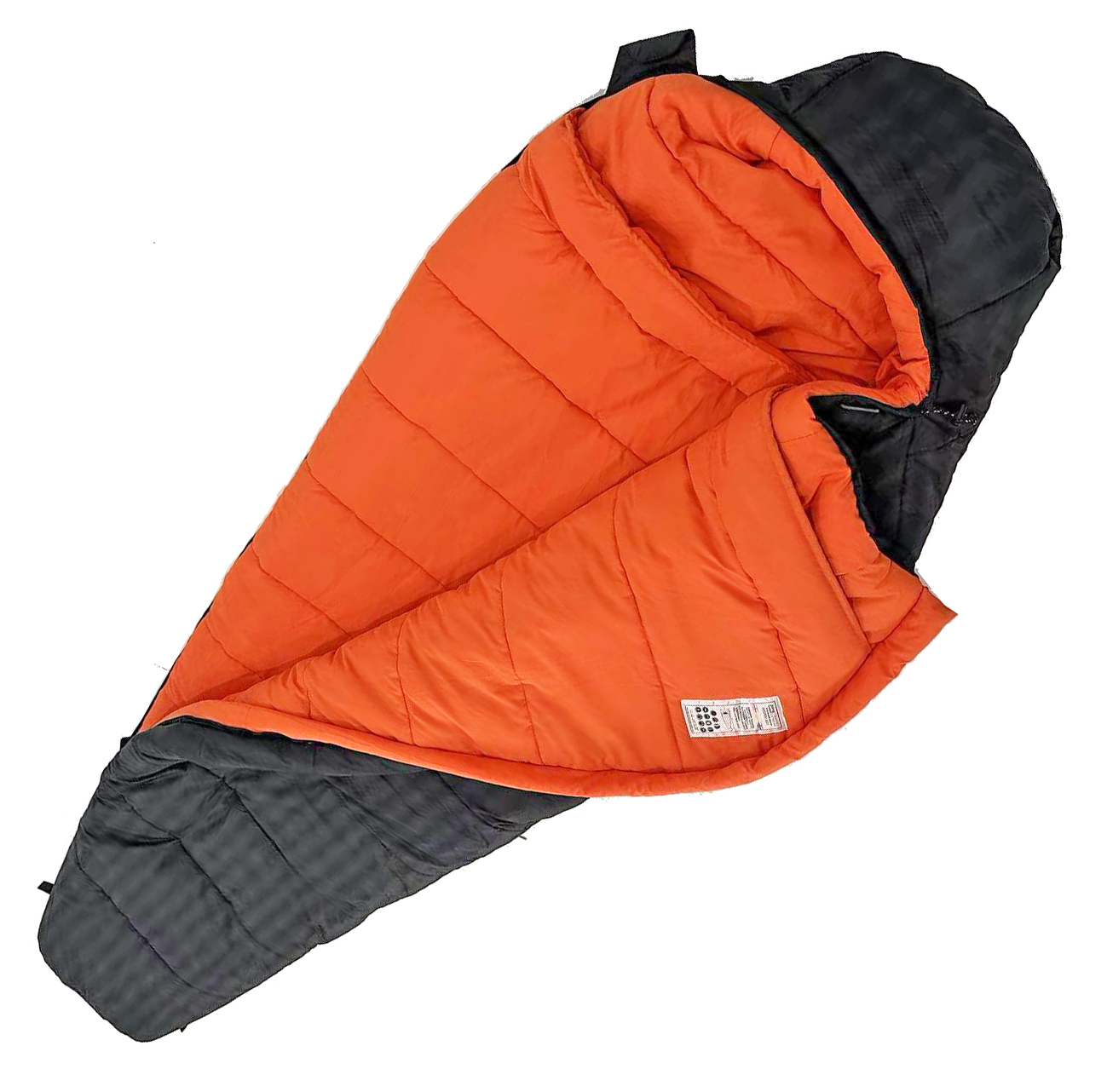 Наружный слой выполнен из износостойкого 20D Nylon Ripstop с водоотталкивающей пропиткой CIRE, защищающей от влаги и конденсата. Внутренняя подкладка из мягкого 210T Brushed Polyester Pongee приятна к телу, не прилипает к одежде и быстро сохнет. Утеплитель Hollowfiber (2×200 г/м²) формирует два смещенных слоя, что исключает образование холодных швов и гарантирует равномерное распределение тепла по всей длине спальника.