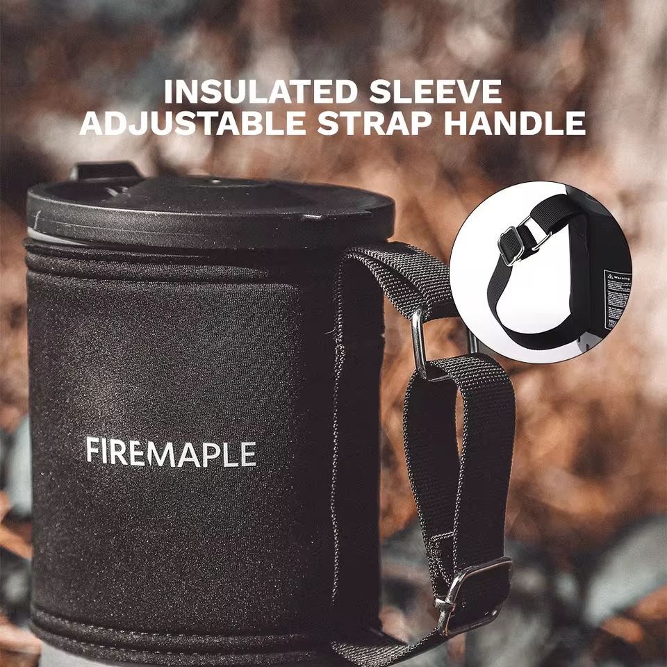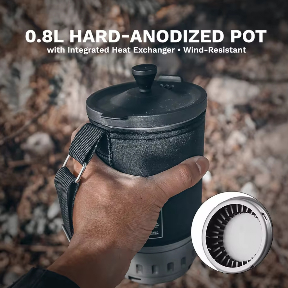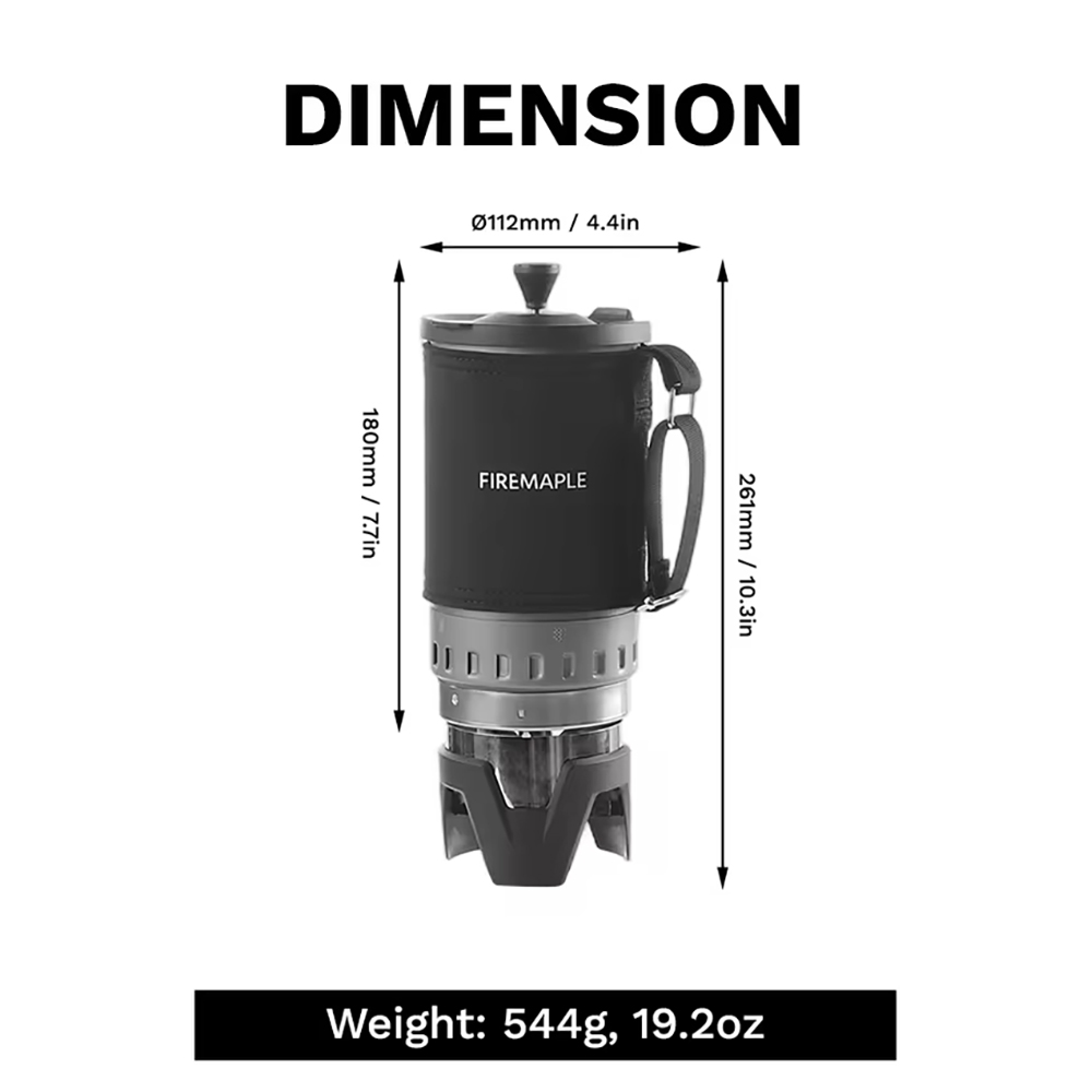 Казанок об'ємом 0,8 л з анодованого алюмінію обладнаний ребристим дном-теплообмінником, що скорочує час кипіння та витрату газу. У лабораторних тестах Fire Maple (температура води і повітря — 20 °C, висота 50 м н.р.м.) 0,5 л води закипало за 3 хв 10 с при витраті 6,3 г газу — в реальних умовах (холод, висота) показники будуть іншими. Ізоляційний чохол з регульованим ремінцем-ручкою дозволяє безпечно тримати гарячий казанок без додаткових рукавичок.