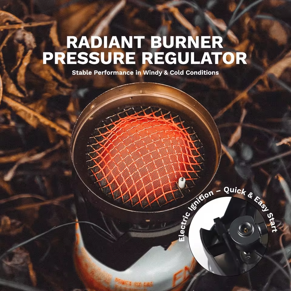 • Радіантний пальник виробляє інфрачервоне випромінювання — ефективніший розподіл тепла і менша залежність від вітру порівняно з відкритим полум'ям.