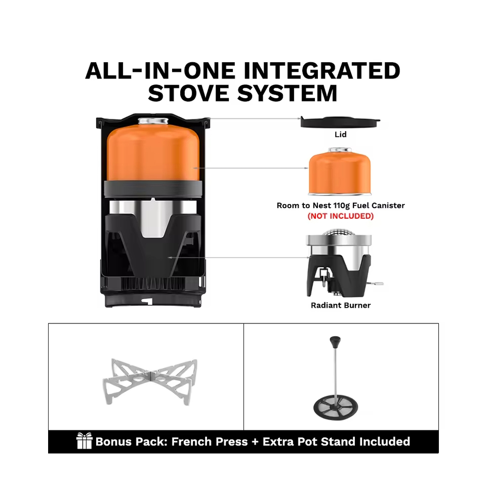 До комплекту входить French Press — сітчастий фільтр для заварювання кави безпосередньо у казанку без додаткового посуду. Також у наборі є запасна підставка для казанка, яку можна використовувати окремо з іншими газовими пальниками.