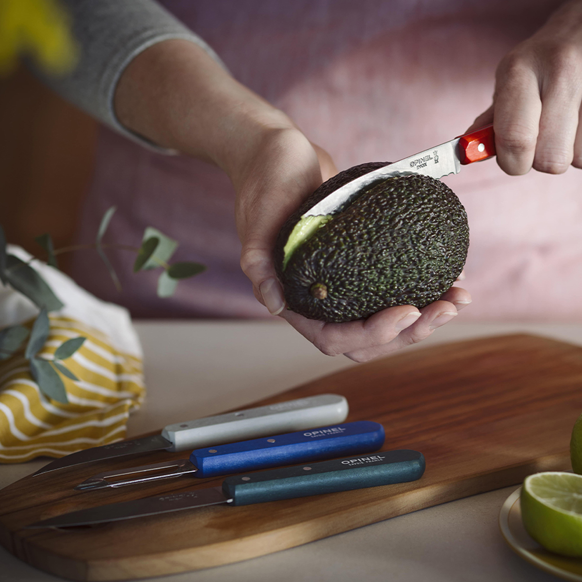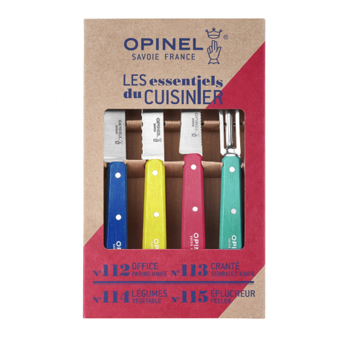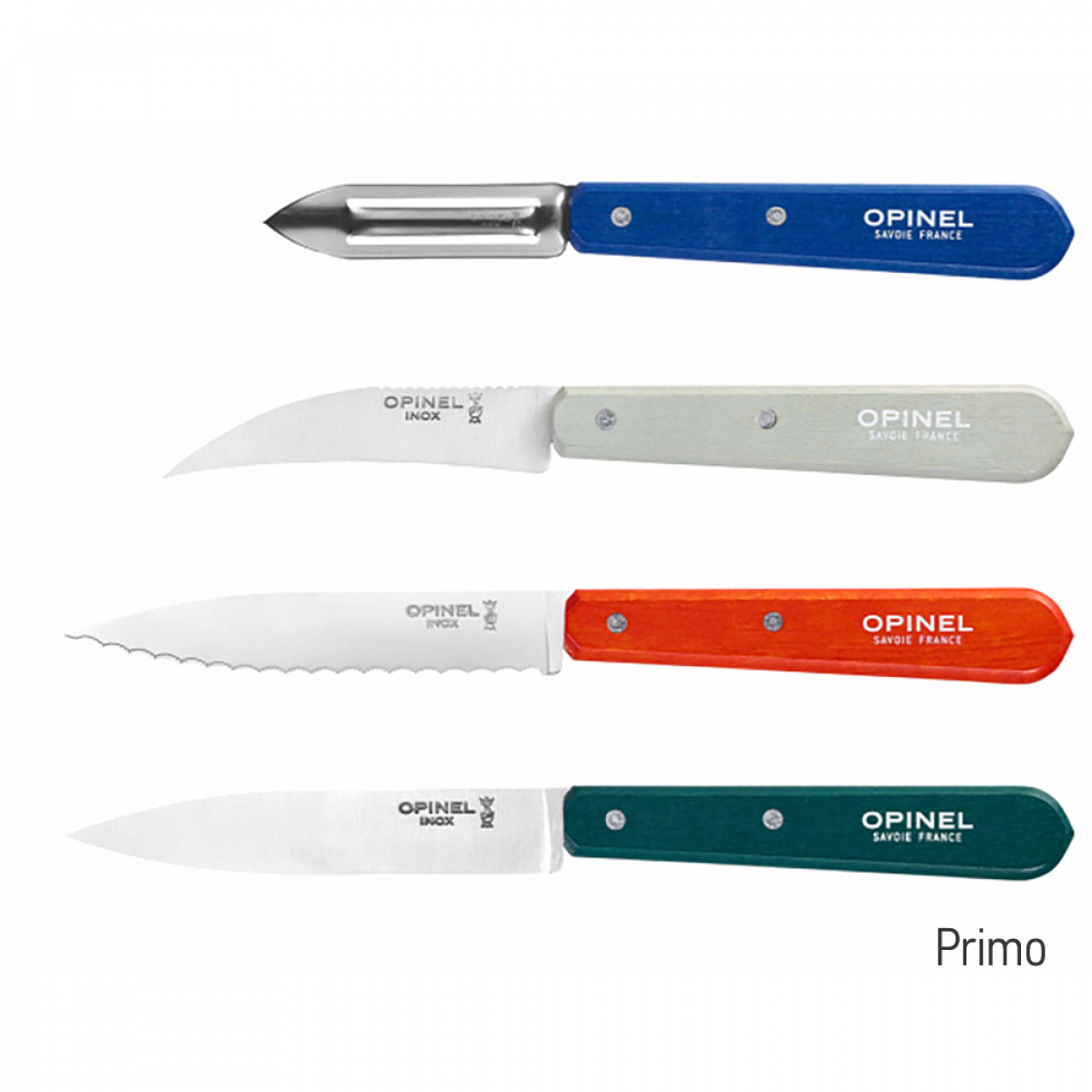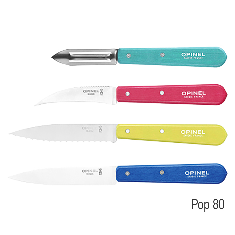 Opinel Les Essentiels — набір із чотирьох кухонних інструментів з фіксованим лезом для базової обробки продуктів. Комплект включає ножі для чищення, нарізки та фігурної обробки овочів і фруктів.