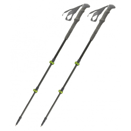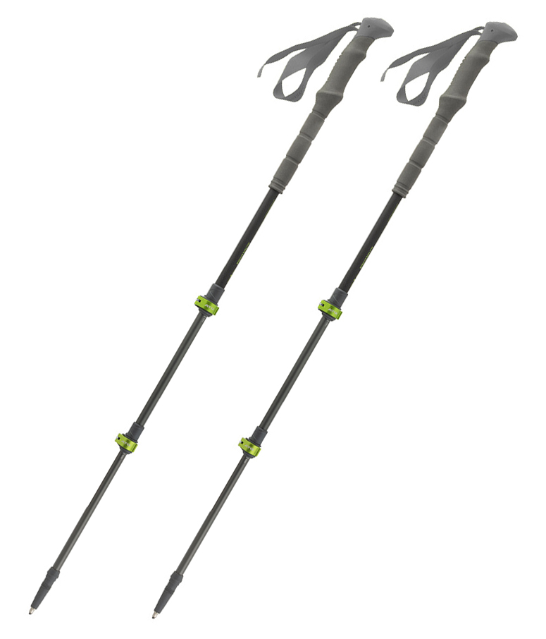 Регульовані петлі (темляки) надійно фіксують зап'ястя. Наконечники з карбіду вольфраму витримують стирання об каміння; у комплекті гумові насадки для зниження вібрації та шуму на твердих поверхнях. До набору входять два комплекти кілець: трекінгові (53 мм) та снігові (80 мм).